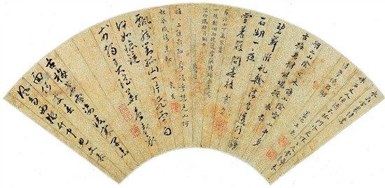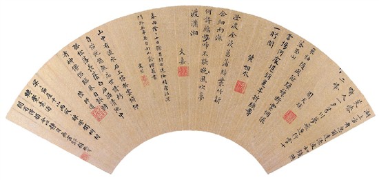 合作书法扇面出现在两个时期,一为明代中后期,一为清代后期。在现存的明清扇面书法中,其他时期出现的合作扇面极少,这是一个非常有趣的现象。明代中后期的合作书扇集中在吴门地区,且都为折扇面。据不完全统计,明代这些合作书扇者,主要有唐寅、文徵明、周天球、王宠、王榖祥、黄姬水、文嘉、文彭、陆师道、顾德育、文元发、陆安道、钱榖、彭年、张凤翼、杜大中、薛明益、杜大绶、文从龙、王穉登、陈汸、袁衮、陈鎏、葛应典、薛益、文从简、陆广明等数十人,其中以文氏家族中的文嘉、文彭、文元发、文从简等出现的频率最高,其次则为周天球、彭年、杜大绶和张凤翼等。这些合作书扇大多无年款。从其郡望看,几乎均为长洲(今江苏苏州)人;从其年龄看,大多出生于十六世纪初,除仅见的文徵明、唐寅合作书扇外,其他作者大多属于文徵明辈的晚辈。从扇面质地看,多为洒金笺;从书体看,多为楷书或行书,几乎没有其他书体;从书写内容看,多为七言诗,且多为歌咏江南风物者。从这些作品可看出,其诗有自创诗,也有抄录他人诗,但都围绕一个主题;署款均为姓名穷款;印鉴均为朱文印。书写七言绝句中,前两句之后往往另起一行,中间还间隔一根扇骨的空间,结体疏朗。所有作品均无上款,也无年款,且均为小字行书或蝇头小楷。这样的书写模式在其他明人合作书扇中也大抵如此(所不同者,钤印中也有白文方印者,很有一种模式化倾向)。因此,不难发现,这些书写者是在一种极为闲散的状态下创作的。或许是应某位组织者(比如文氏族人如文彭、文嘉等)的邀请,以文氏文人为中心所举行的不定期的雅集中合作完成,也有可能是在一次大型聚会中文人们集中合作而成大量书扇,但更大的可能是应某些艺术赞助人的特殊要求而度身定制。在明代中后期,吴门地区经济、文化都相对发达,文人雅士多雅擅临池,当时王世贞就曾发出过“天下书法归吾吴”的感叹,在此语境下,出现这种极具区域特色的合作书扇现象,也就顺理成章了。