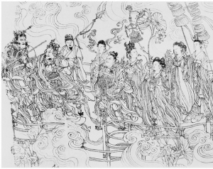 《八十七神仙卷》画名系徐悲鸿所定。它是我国美术史上极其罕见的经典传世之作,代表了中国古代白描绘画的最高水平,其艺术魅力可与宋代张择端的《清明上河图》比肩。《八十七神仙卷》,作者佚名。深褐色绢面上用遒劲而富有韵律的,明快又有生命力的白描线条描绘了八十七位神仙从天而降,列队行进。场面宏大,人物比例结构精准,神情华妙,构图宏伟壮丽,线条圆润劲健,姿态丰盈而优美,将天王、神将那种“虬须云鬓,数尺飞动,毛根出肉,力健有余”的气派表现得淋漓尽致。那冉冉欲动的白云,飘飘欲飞的仙子,使整幅画作具有“天衣飞杨,满壁风动”的艺术感染力。这幅作品虽然没有着任何颜色,却有着强烈的渲染效果。