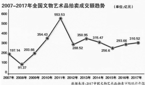 8月9日,多家专业机构在上海发布一系列文物艺术品拍卖市场报告。中拍协《2017中国文物艺术品全球拍卖统计年报》报告显示,2017年全国文物艺术品拍卖成交规模稳步回升,成交额达310.52亿元(不含佣金),但截至2018年5月15日完成结算153.22亿元,结算进度不足一半。中国文物艺术品在海外市场尽管市场成交额回升8%,但成交率却呈下滑趋势,从2011年的69%降至2017年的47%。